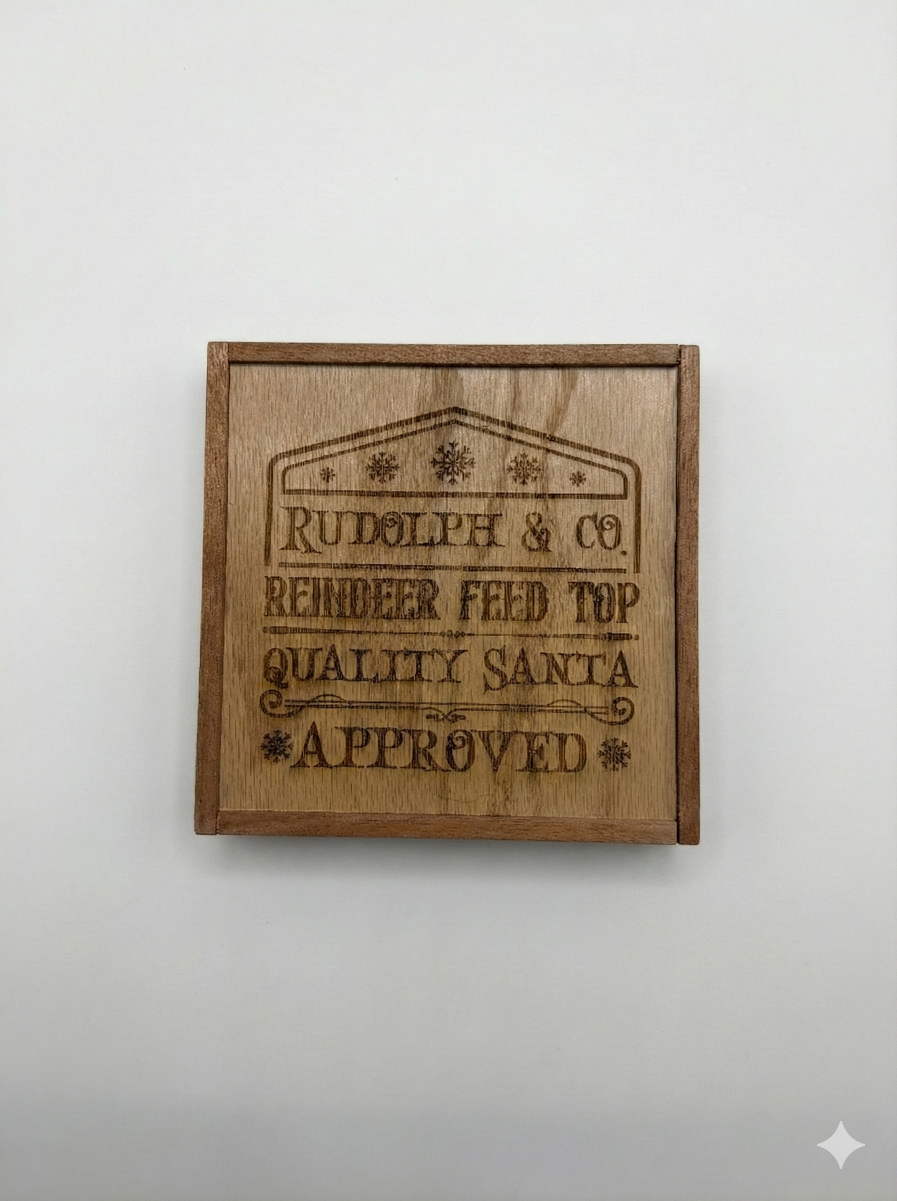 Design: Features laser-engraved details, including the "Rudolph & Co." banner, "Reindeer Feed Top Quality," and the important "Santa Approved" stamp, all framed by festive snowflakes and decorative accents.